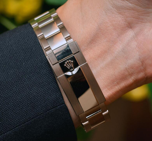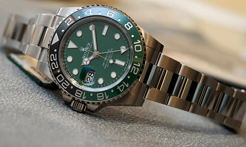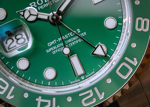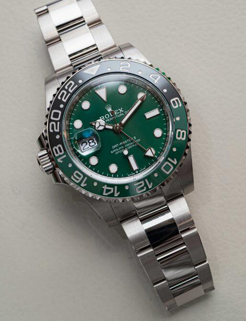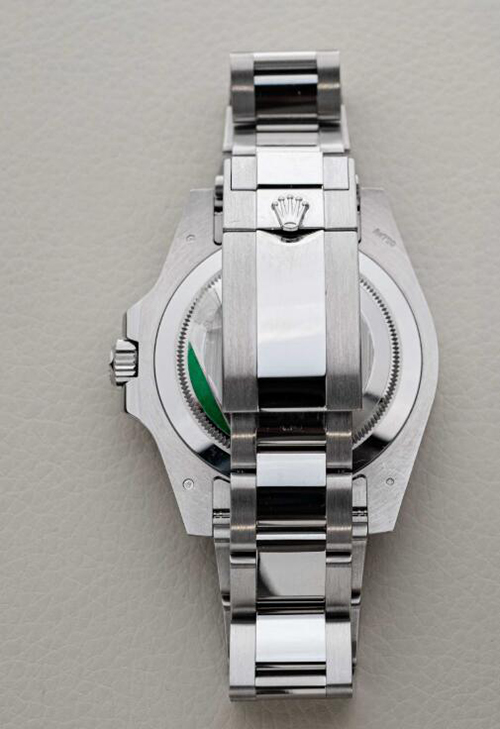 ベゼル:両方向回転式、24時間目盛り入り グリーン/ブラックの2色のセラミック製セラクロムインサート、数字と目盛り入り